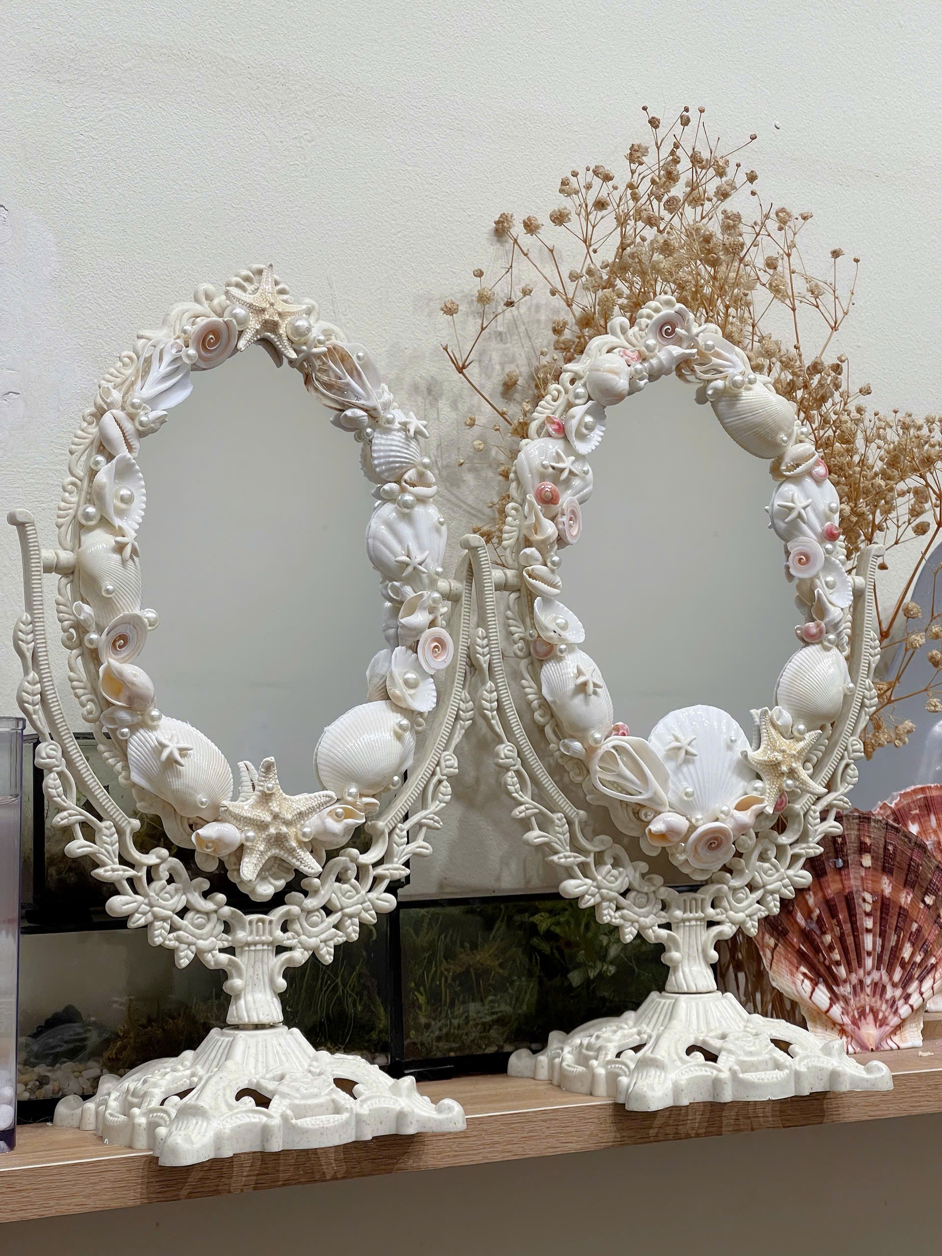 Bring the charm of Vietnam’s seaside to your home. Each mirror is meticulously handcrafted with natural seashells, delicate starfish, and pearl accents — making every piece one-of-a-kind. Perfect for a vanity table or as a coastal décor statement, this mirror captures the elegance and tranquility of the ocean.